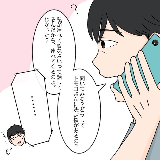 「聞いてみる?どうしてトモコさんに決定権があるの?私が連れてきなさいって話してるんだから、連れてくるのよ。わかった?」ゴリ押しする義母の言葉に呆れる夫は、