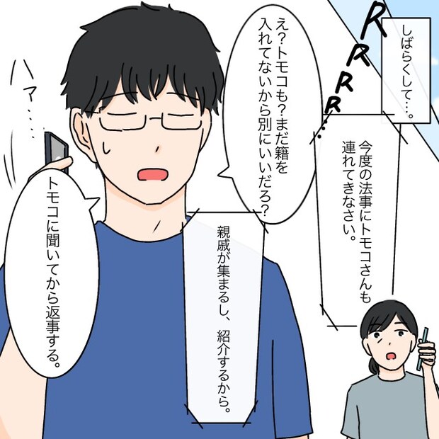 「今度の法事にトモコさんも連れてきなさい」義母から電話でそう言われ、「え?トモコも?まだ籍を入れてないから別にいいだろ?」夫がそう答えると、「親戚が集まるし、紹介するから」全く引こうとしない義母の言葉に「はぁ・・トモコに聞いてから返事する」とため息をつきながら答えると、
