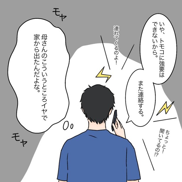「いや、トモコに強要はできないから。また連絡する」と答えると、「連れてくるのよ!ちょっと!聞いてるの!?」電話越しでわめく義母の声を聞きながら、「母さんのこういうところイヤで家から出たんだよな」とモヤモヤしながら呟きました。