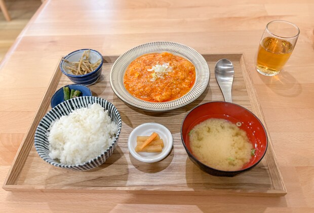 メインに小鉢、サラダ、ご飯、スープ、デザートにドリンクまでも付いてくるボリューミーな内容の定食です。