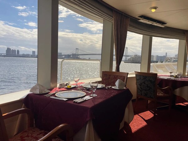 ランチクルーズ限定の、「フランス料理フルコースプラン」も用意。窓側席確約と席指定なしを選ぶことができ、冬ならではの澄んだ東京湾の景色を眺めることができる。
