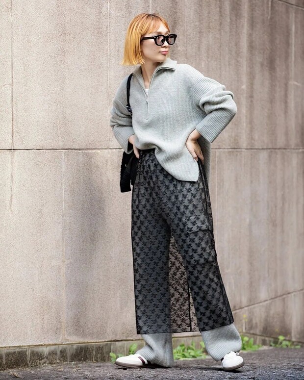 リラックスムード満点のリブニットのセットアップですが、レーススカートを1枚重ねるだけで一気に今っぽく。小物はレースに合わせてブラックでまとめつつも、スニーカーやバッグなどスポーティなアイテムをチョイスすることでレースの甘さを緩和。