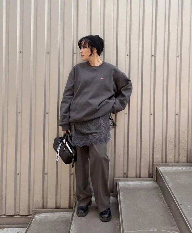 編集部のおしゃれ番長Tも、やっぱりレース。こちらはロングタイプのレースタンクをスエットの下に重ねて着用。スエットとパンツというシンプルなワンツーコーデにレースを入れることで奥行き感のある着こなしに。全体を同トーンでまとめれば、レースも目立ち過ぎず自然になじむ。