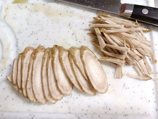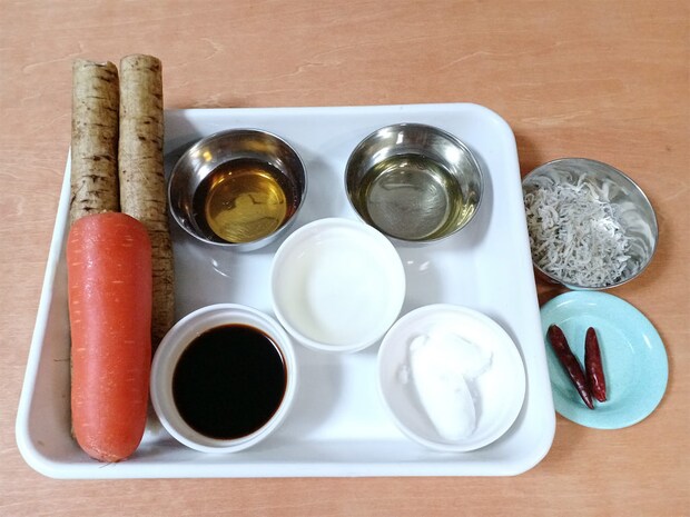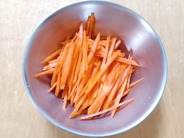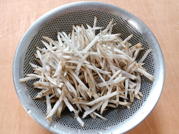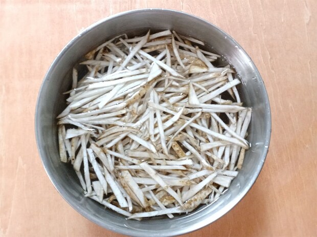 1. ごぼうをたわしで洗い、斜めの薄切りにし、切ったものから水にさらす。にんじんは皮を剥き、細切りにする。