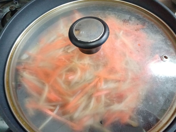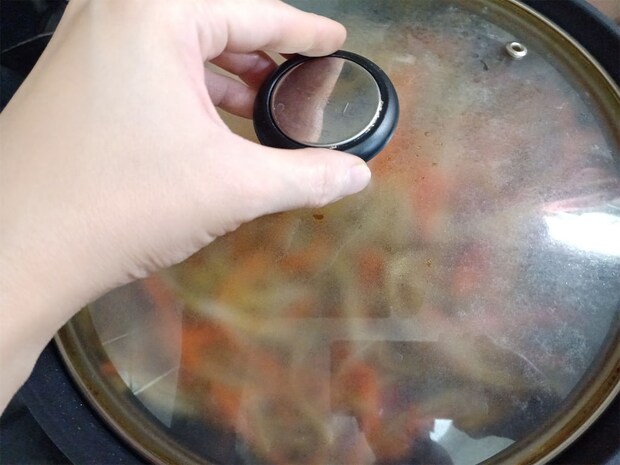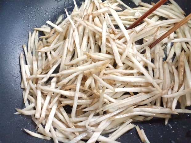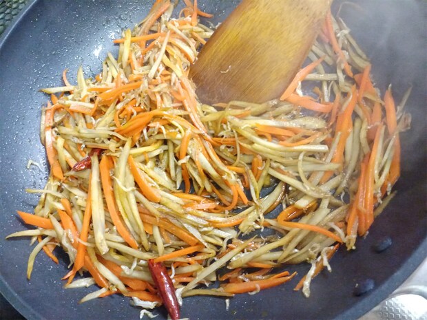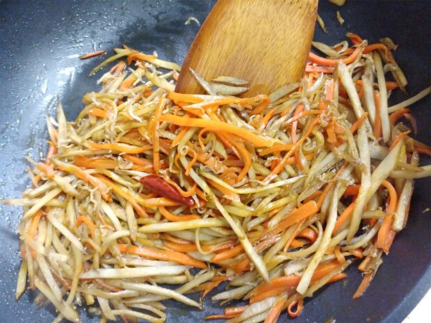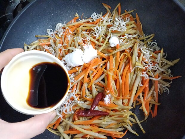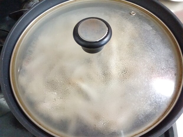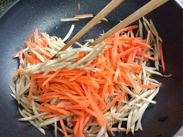 ごぼうに油が回ったらフタをして2分ほど蒸し焼きにしましょう。