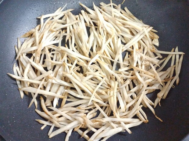 2. ごぼうの水気を切り、フライパンにこめ油とゴマ油を熱してごぼうを炒める。油が回ったらフタをして、時々混ぜながらしんなりするまで2分ほど炒める。