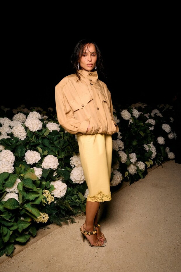 身長157㎝と小柄でありながら、絶妙なバランスでおしゃれを楽しむゾーイ。この日は、彼女が好むミディ丈のスリップスカートにパワーショルダーのボンバージャケットで、重心を上げて。足元はレモンモチーフが揺れるアンクルストラップサンダル。さりげなくイエローのスカートとリンクさせた。