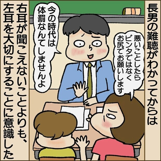 右耳の難聴がわかってから、忍者ママさんの中でもさまざまな変化があったようです。何よりも、聞こえないことでネガティブになるのではなく、自分なりにポジティブに捉えて新しい見方をしている長男の姿勢に、忍者ママさんはずいぶんと救われたことが描かれています。