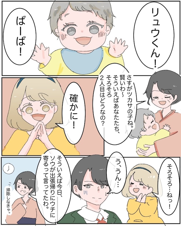 時が経ち、リュウは言葉を話せるまでに成長しました。「そろそろ2人目はどうなの?」という母の提案に、目を輝かせて「確かに!」と言うチナツ。「そろそろ・・・ねっ!」とチナツに言われた俺は、同意するしかありませんでした。すると母が「そういえば今日、ソウが出張帰りにウチに寄るって言ってたわ」と言いました。