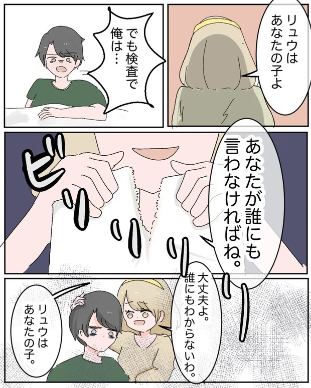 報告書を見てもなお、リュウは俺の子だと言い張るチナツ。「でも検査で俺は・・・」と言いかけると、彼女はおもむろに書類を破き、ニヤリとした表情で「あなたが誰にも言わなければね」と付け加えました。そして、「大丈夫よ、誰にもわからないわ、リュウはあなたの子・・・」まるで催眠術をかけるように繰り返しました。俺は考えることをやめ、リュウの偽りの父親として、チナツと夫婦でい続けることを選びました。