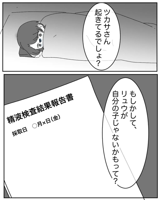息子リュウの本当の父親は自分じゃなかったー・・・真実に気付いてしまったツカサさん。気分が悪くなり自室で寝ていると、チナツさんが部屋に入ってきました。そして例の封筒を見つけると「なぁんだ、そういうことね」と口元を緩ませました。元妻のカオルさんから送られてきたのは、不妊治療を始めたときに受けた精液検査の報告書でした。子どもができない原因は自分だったと落ち込むツカサさんに、チナツさんは書類を破き「あなたが誰にも言わなければ、リュウはあなたの子よ」と言います。その言葉にツカサさんは考えることをやめ、リュウくんの偽りの父親として、チナツさんと夫婦でい続けることを選びました。時が経ち、リュウくんは言葉を話せるまでに成長しました。「そろそろ2人目はどうなの?」という母親の提案に、「そろそろ・・・ねっ!」とチナツさんに言われたツカサさんは、同意するしかありませんでした。しばらくして、出張帰りのソウさんが実家にやってきました。「疲れたから部屋で仮眠とるよ」と、来て早々自室にこもるソウさん。すると、それを見計らったように、チナツさんが部屋のドアをノックしました。ゆっくりとドアを開け、チナツさんを迎え入れるソウさん。これで2人目も安泰だね・・・そう聞こえたような気がしました。