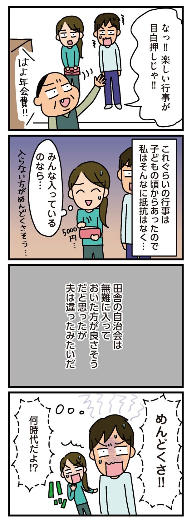 前回、半ば強制的に自治会入会の話を進めた町民。引っ越しの挨拶回りで癖の強い町民たちを目の当たりにしたアキラは、入会を断ったら酷い目に遭うかもしれないと、渋々年会費を払うことにしたのだが…?