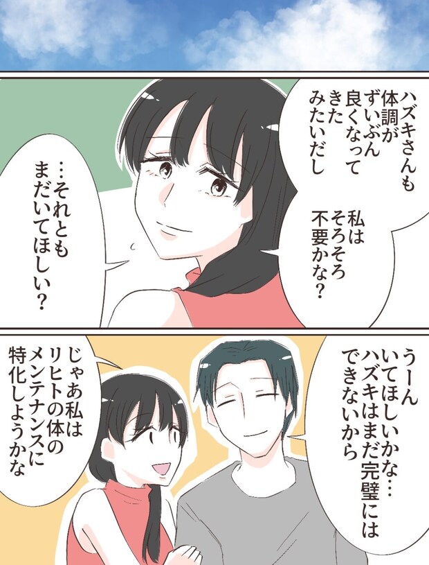 ハズキさんの入院中だけユウコさんに家事をしてもらうつもりが、ユウコさんとの生活が気に入って手放せなくなったリヒトさん。ハズキさんの退院後もユウコさんに家にいて欲しいリヒトさんは、家事は代行サービスを利用して自分はリヒトさんの体のメンテナンスに特化する、というユウコさんの提案に乗ることにしました。