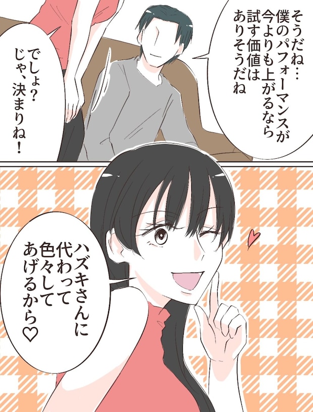 「そうだね・・。僕のパフォーマンスが今よりも上がるなら試す価値はありそうだね」そう答えると、ユウコは嬉しそうに「でしょ?じゃ、決まりね!」と言って「ハズキさんに代わって色々してあげるから!」とウィンクしました。