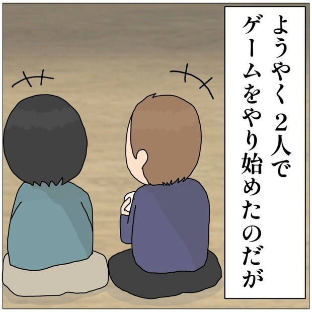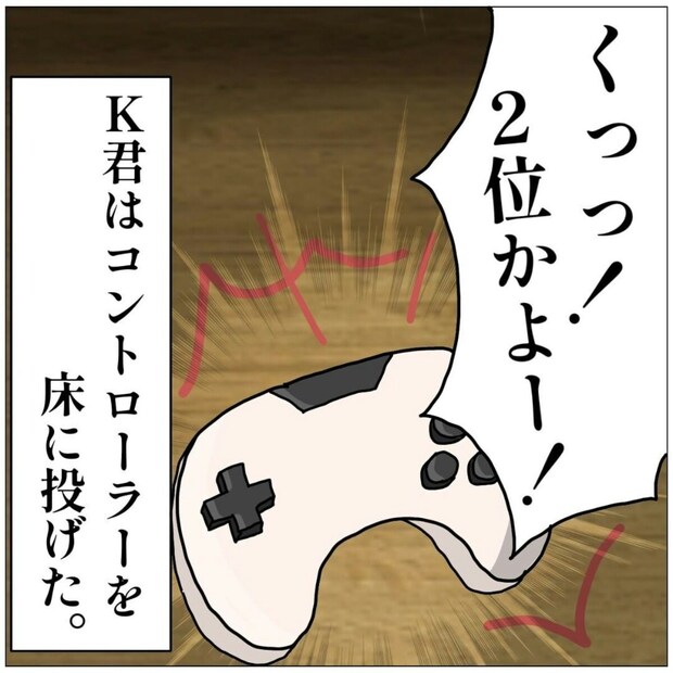 ゲームを独り占めしたまま離さないKくん。見かねた主人公は、2人でできるゲームをやるように提案しました。2人で対戦ゲームを始めると、今度は勝負に負けたKくんが怒ってコントローラーを床に投げつけてしまいました。しかしKくんママは息子を怒ることなく、笑い飛ばしたのです。