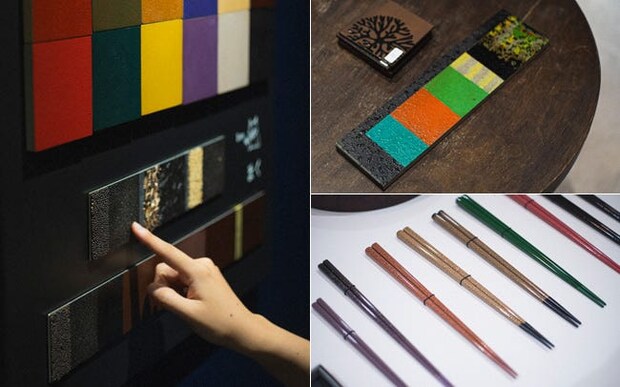 これも津軽塗?と地元民も驚くモダンな作品がずらり。手に取っていろんな角度から鑑賞したくなるものばかり。箸やピアスは大切な人へのプレゼントにもうってつけ! バネルを見ながら、津軽塗の特徴である「研ぎ出し変わり塗り」の工程を学ぶこともできる