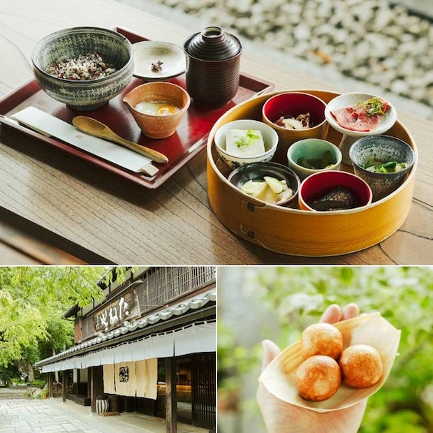 上/日牟禮八幡宮のすぐそば 左下/近江産もち米のおこわ、県内食材で作るおばんざい7品、汁物、香物、小豆茶が付く、たねや膳3630円 右下/もちで粒あんを包んで焼きあげた香ばしいつぶら餅3個入り421円