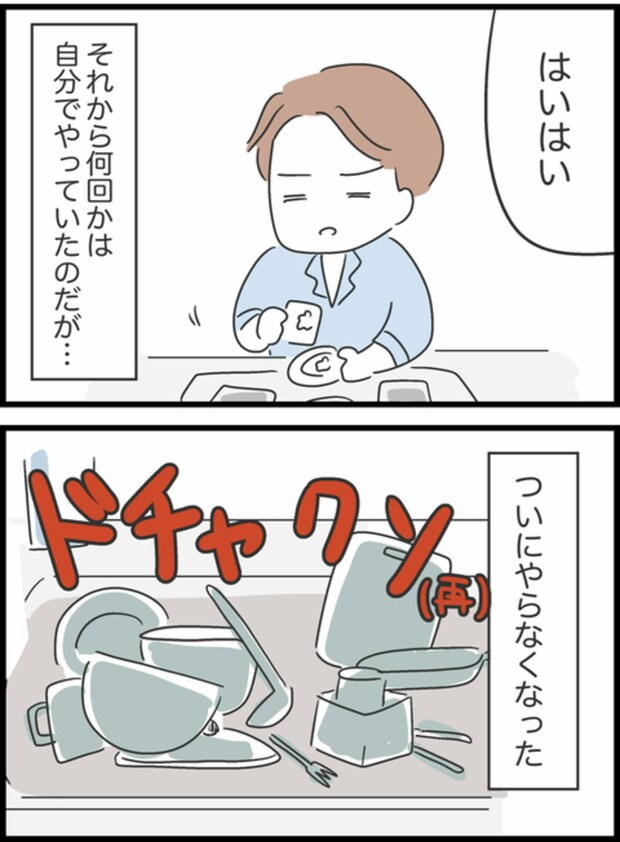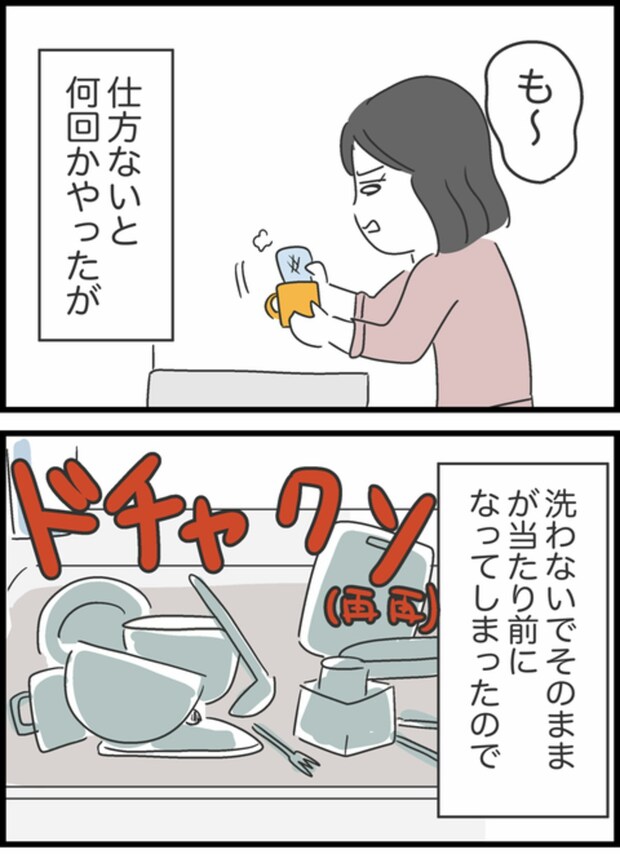 ようこがクレームを言ったことで、夜中に使ったものは皿洗いをするようになったしょうたでしたが、それもずっとは続かず、とうとうまた放置されるように。自分でさせるため「今日はやらない」と決めたようこでしたが…。