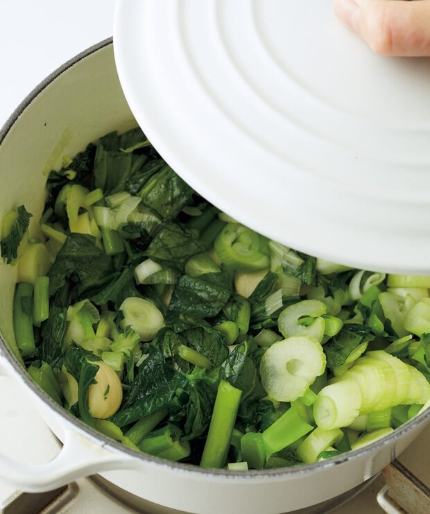 野菜をじっくり蒸し焼きにすることで、素材が持つ甘みやうま味が引き出されます。肉や魚介類を加えなくても、十分満足できるスープに。