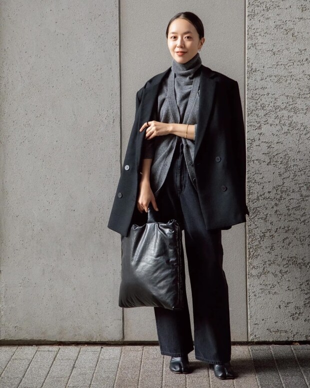 「グレーのワントーンで一見シンプルに見えますが、同素材のニットをレイヤードさせて、メリハリをつけてみました。色みがシックにまとまっているので、単調なスタイリングにならないようニューベーシックになりつつあるビッグシルエットのジャケットや、光沢感のあるバッグを取り入れました」