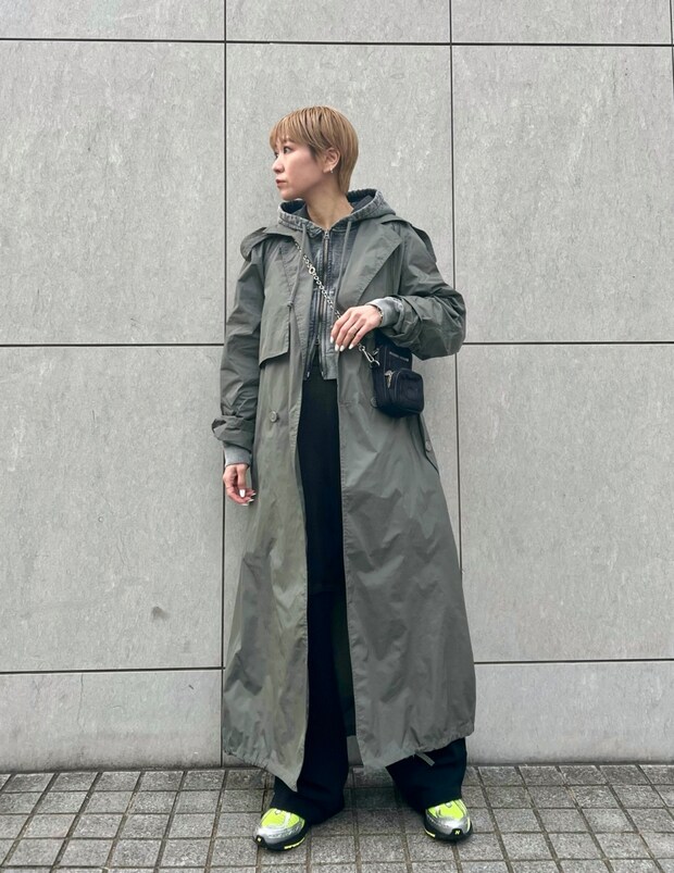 「個性的なスニーカーを主役に、大人でも挑戦できるスポーツスタイルに。スエットのセットアップにロング丈のトレンチコートを羽織り、カジュアルになり過ぎないよう意識しました。トレンチコートはオーバーサイズシルエットなところが、ラフなスタイルが好きな私にはピッタリ。さらにナイロン100%のシャカシャカ素材なので、ここでも少しスポーティな雰囲気を取り入れて統一感を出しています」