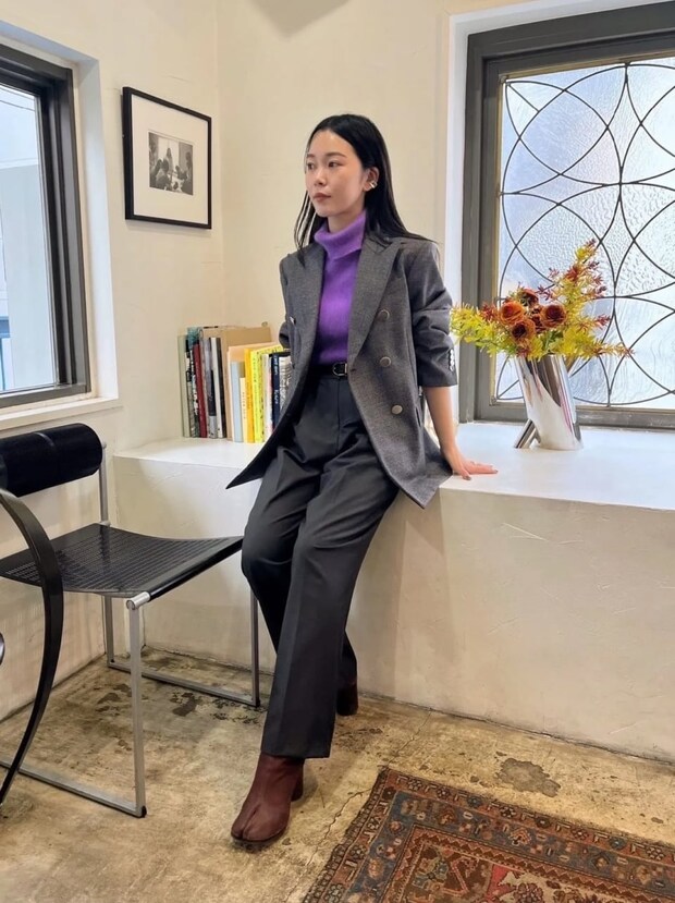 「同系色のコーディネートの中に差し色でパープルをもってくることで、少し春っぽさを意識しました。ジャケットとパンツがオーバーサイズでボーイズライクになりやすいので、中に合わせたニットはタイトめのシルエットを、さらにブーツはヒールをチョイスして女性らしさをプラス」