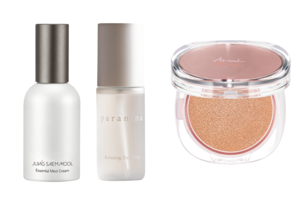 左上から:ジョンセンムル エッセンシャル ムルクリーム 50mL ¥7,150(D-Nee コスメティック)、リラクシングデイミスト¥3,980(パラニーニャ)、アリウル インクフェザークッションファンデーション SPF50+・PA++++ ¥4,500(ビューティーファクトリー)