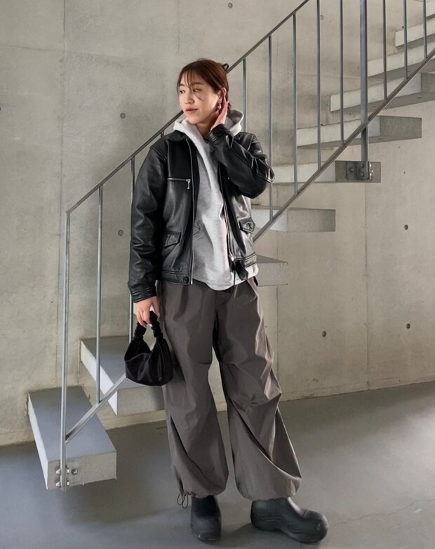 レザージャケット×モノトーンでアウトドアパンツをモダンに