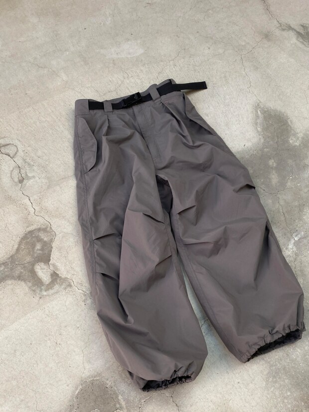 「立体的なシルエットがポイントのマーモットキャピタルのボリュームパンツを主役に。カジュアルで着ていてストレスのない装いが好きですが、冬場はカジュアルになり過ぎすぎないよう、ウールコートやレザーのアイテムを合わせるようにしています。グレーとブラックでまとめて統一感を出しました」
