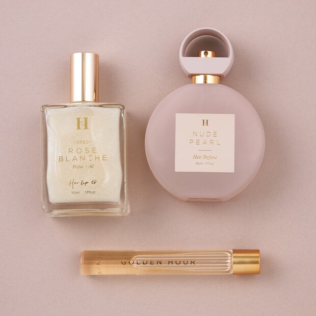 左上から時計回りに:パフュームオイル ローズブランシュ 50mL ¥6,490、ヘアパフューム ヌードパール 50mL ¥5,500、ロールオンパフュームオイル ゴールデンアワー 9mL ¥3,960(全てハーリップトゥ ビューティ)