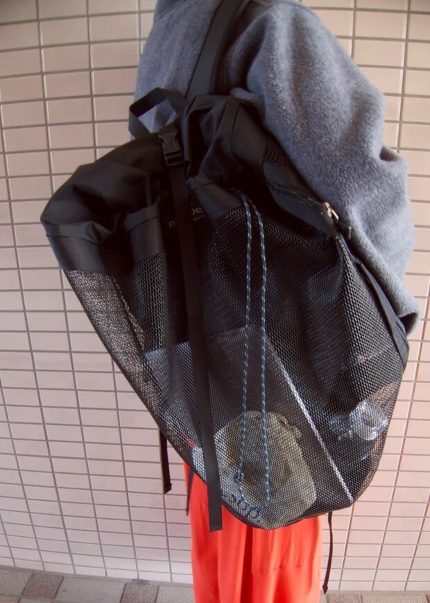 「モンベルのバックパックはメッシュになっているので、中に入れるもの次第で印象が変わります。アウトドアシーンだけでなく、仕事やお買い物、旅行などオールマイティに使えるので重宝しています」mont-bellのバックパックは本人私物