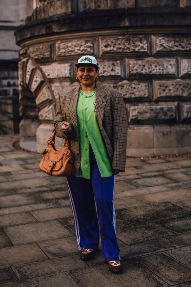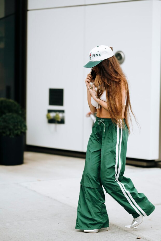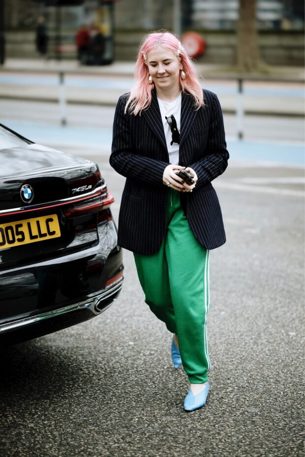 海外ではよりスポーティに見えるネイビーやグリーンのトラックパンツが人気な模様。その分ジャケットやトゥの尖ったヒールなど、ちょっぴりフォーマルな要素をプラスするのが◎。