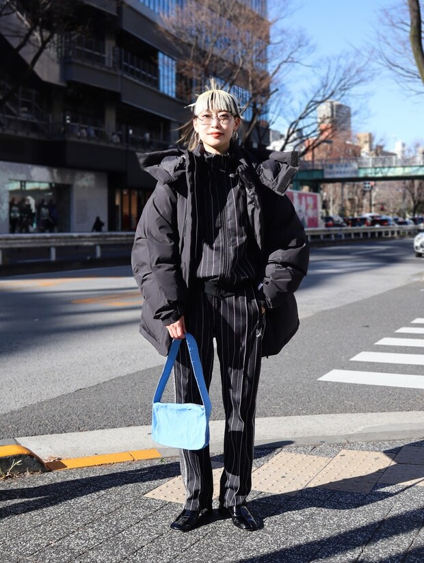 「光沢をおさえたナイロン素材のトラックパンツは、スポーティ過ぎないシックな印象が◎。程よいワイドシルエットにサイドのパイピングラインがスタイルアップして見える点もお気に入りです。小物づかいで自分らしく仕上げました」