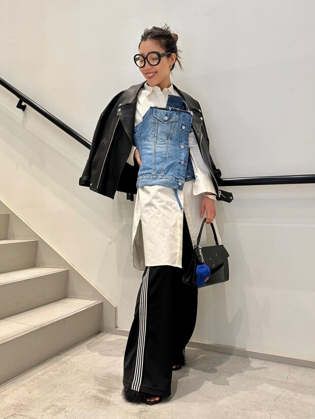 「少し細めのラインなので、いわゆるジャージ感が出過ぎず、股下はゆったりめでワイドになり過ぎない。美脚見えも叶えてくれる優秀なパンツです。きちんと感のあるレザーバッグにさり気なくキャップモチーフのチャームをつけて遊び心を」
