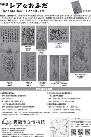 飯能市立博物館では、10月12日(日)~12月7日(日)の期間、特別展示室・展示ホールにて、特別展「レアなおふだ 古くて珍しいおふだ、たくさん見せます」を開催している。また、担当学芸員による展示解説や関連講座も実施する。