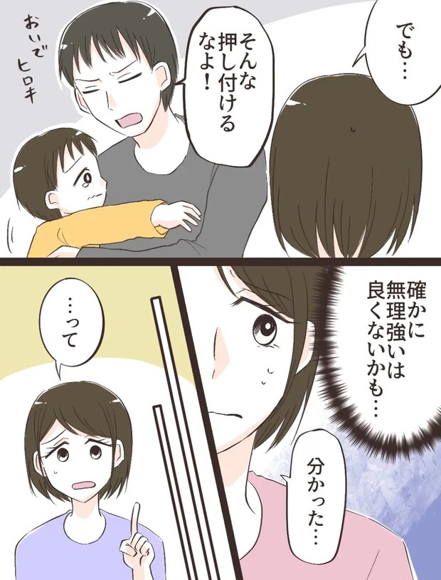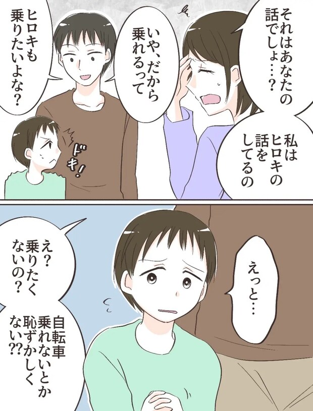 「オレは」って言われても知らないし。今はヒロキの話をしているのに、夫は何かと自分の子どもの頃を引き合いに出して「できたけど?」と上から目線で言ってくるのです。ショウヘイに「・・・だから乗れるって。ヒロキも乗りたいよな?」と言われたヒロキは、突然苦手意識を持ってしまっている自転車の話をされて居心地が悪そうに言葉に詰まっていました。するとショウヘイは「え?乗りたくないの?自転車乗れないとか恥ずかしくない?」と煽りました。