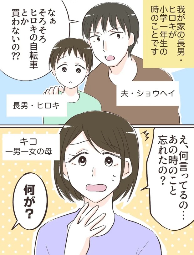 長男ヒロキが小学校1年生の頃。夫ショウヘイが「そろそろヒロキの自転車買わないの?」と不思議そうに言ってきたので「え、何言ってるの・・・あの時のこと忘れたの?」と驚いて聞くと、ショウヘイは全く覚えていない様子で「何が?」とキョトンとしていました。