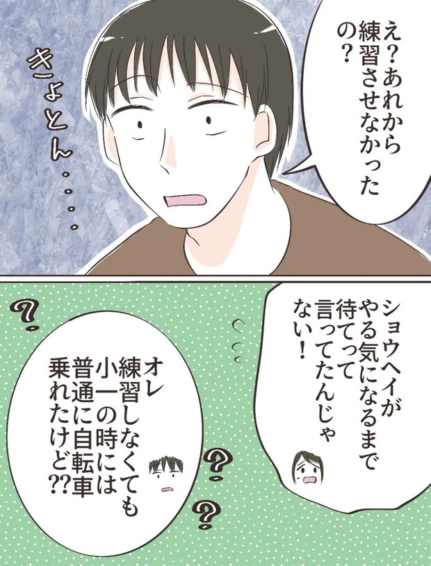 私の話を聞いてまだキョトンとしているショウヘイ。「あれから練習させなかったの?」と言われ、「ショウヘイがやる気になるまで待てって言ってたんじゃない!」というと、「オレ練習しなくても小1の時には普通に自転車乗れたけど?」と当然のようにショウヘイは言いました。