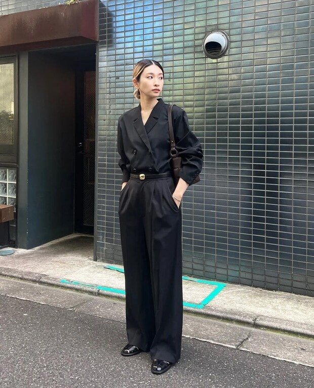 「これからの季節に重宝するシャツジャケット。ダブルのジャケットデザインですが、あえてボトムにインして新鮮なバランスで着るのがオススメです。ワイドパンツやベルトなどきちんと感のあるアイテムを合わせ、マニッシュなオールブラックスタイルにまとめました」