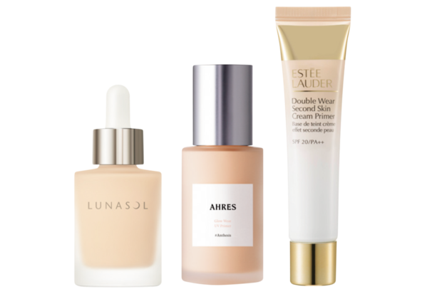 左から:ルナソル カラーオイルセラム N01 SPF30・PA++ 25mL ¥7,700(カネボウ化粧品)、グロウ ウェア UV プライマー SPF50+・PA++++ 30mL ¥3,850(アーレス)、ダブル ウェア セカンド スキン クリーム プライマー SPF20・PA++ 40mL ¥6,820(エスティローダー)