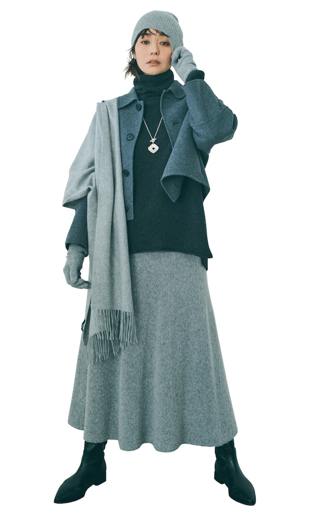 コート¥39,930(ネイヴ)、タートルネックニット¥49,500、ニット帽・マフラー・グローブ[3点セット]¥42,900(全てセオリー/リンク・セオリー・ジャパン)、ニットスカート¥38,500(ギャルリー・ヴィー/ギャルリー・ヴィー 丸の内店)、ネックレス¥126,500(ノアーク/エスケーパーズオンライン)、ブーツ¥19,800(ガリャルダガランテ/ガリャルダガランテ 青山店)