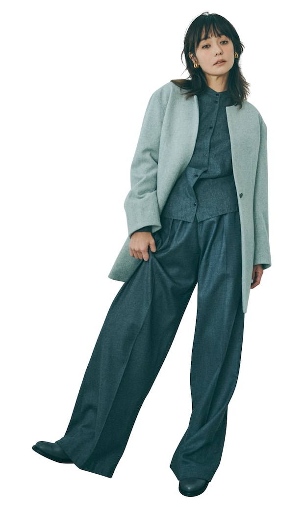 「ウエスト部分がキュッとなっていれば、小柄な人でもバランスよく見えるはず。特にワントーンコーデのときは変化もついて◎。コートも中のブラウスもお腹まわりがタイトなデザインのものを選んでいるから、自然とシャープな印象に」