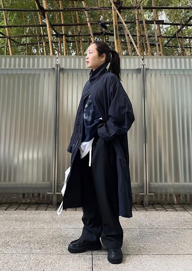 ラフなシルエットを生かしながら重ね着や小物使いで軽やかに。「ワイルドシングスとアダム エ ロペの別注アウターは撥水加工が施されていて晴雨共に大活躍のコート。柔らかく、とろみのある素材なのでカジュアルながらも女性らしい印象で着られます」