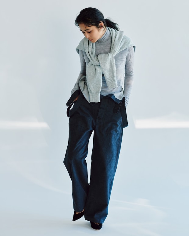 タートルネックトップス¥17,600、上に重ねたノースリーブトップス¥11,000(共にオーラリー)、肩に巻いたカーディガン¥19,800(フレイ アイディー/FRAY I.D ルミネ新宿2店)、パンツ¥49,500(ペッピーノ ペッピーノ デニム/RHC ロンハーマン)、ピアス¥25,300(ボーニー/エドストローム オフィス)、パンプス¥57,200(ネブローニ)