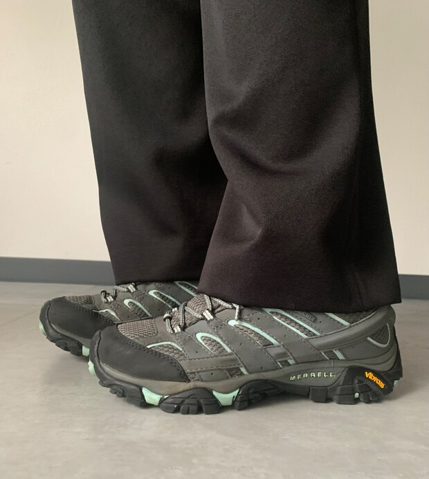 「3年ほど愛用しているメレルのゴアテックススニーカーは、防水、軽量などの機能性もさることながら、ワイドモデルなので幅広の私の足にもちょうどよく、見た目のボリューム感もお気に入りです」MERRELLのスニーカーは本人私物