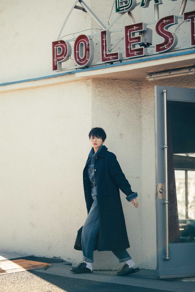 デニムジャケット¥27,500、デニムパンツ¥24,200、ベルト¥77,500(全てカルバン・クライン/カルバン・クライン カスタマーサービス)、コート¥66,000(バッカ/ビー エディション ニュウマン新宿店)、バッグ¥24,090(トゥティエ)、シューズ¥49,500(シンヤコヅカ/ザ ウォール ショールーム)、眼鏡¥36,300(ジェントルモンスター/エム)、ネックレス¥22,000(アフェクト)、ソックス¥3,960(MOON TREE PLANET)
