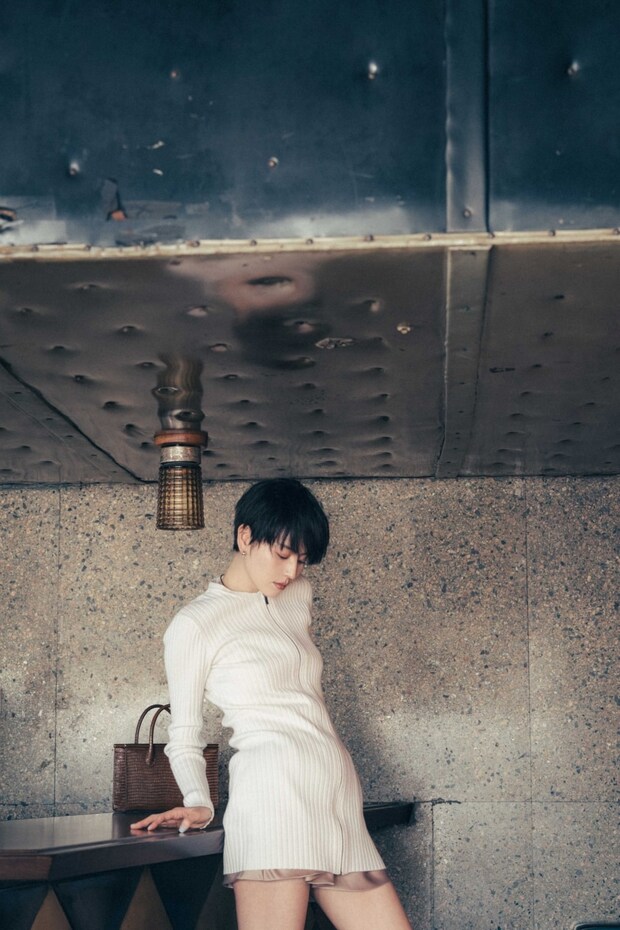 この白ニットとシルクのミニスカートでは、彼女のスタイルのよさ、肌のきめ細やかさや、大人の女性の艶やかさ、ショートヘアのウィッグで少年のような快活さと少女性を引き出したくて。足元は見えていませんが、フラットシューズを合わせていて。このミニスカートにフィット感のあるニットにフラットシューズの着こなしができるのは、長澤まさみしかいないよ!? というのも見せたかったんです(笑)。