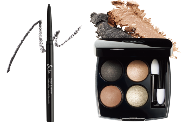 【使用アイテム】左から:滑らかな描き心地、美発色、ロングラスティングの3拍子が揃う。&be ペンシルアイライナー マットブラック ¥1,320(Clue)、透け感のあるブラックに、華やかなラメやなじみ系ベージュの組み合わせ。強さと気品を兼ね備えた瞳へ。レ キャトル オンブル 388 ¥8,360(シャネル・2/9限定発売)