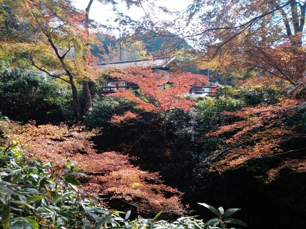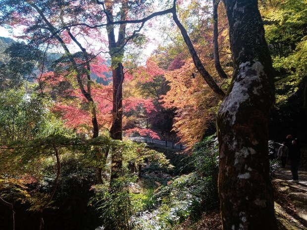 筆者が訪れた11月中旬は、渓谷沿いや本堂周辺で真っ赤なモミジが見られましたが、全体的にはまだ色付いていない葉も半分近くあるように感じられました。