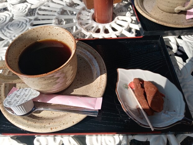 筆者が訪れた際には、コーヒー・抹茶も販売されていました。最寄りのカフェなどへは少し距離があるので、バスで訪れた人にはありがたいですね。テーブルも設置されているので、休憩しながらいただくことができます。